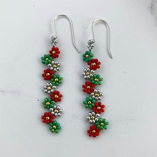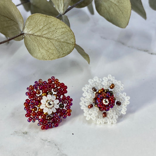 Beaded Flower Stud Earrings - red, white, brown, copper, blue