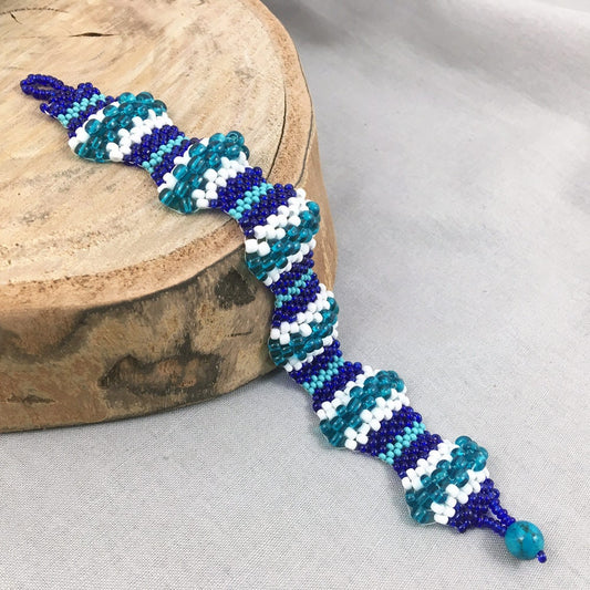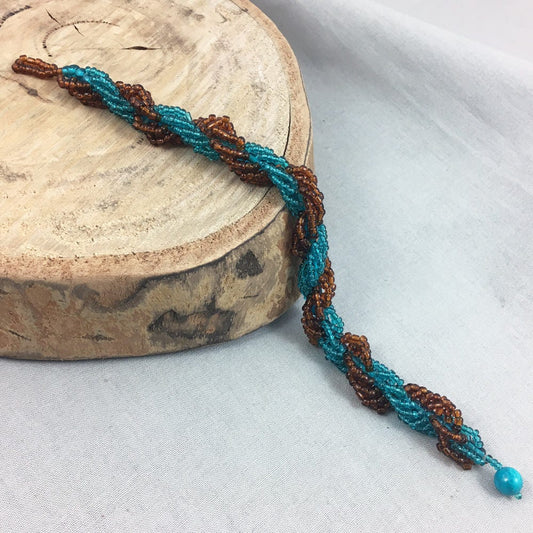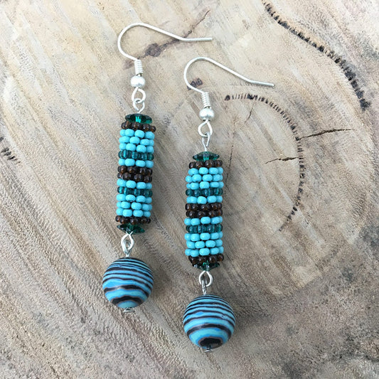 Beaded horizontal striped dangle earrings - blue metallic, turquoise, brown