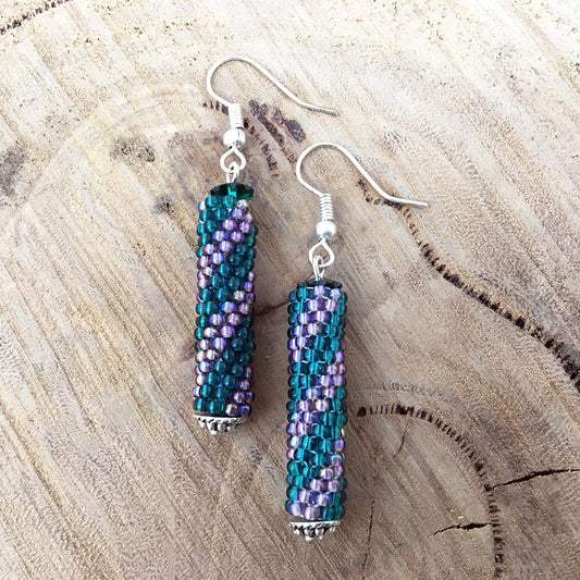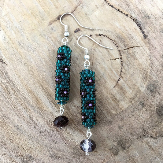 Beaded dangle earrings - diagonal stripes in green, brown, purple, black