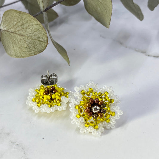 Beaded Flower Stud Earrings - yellow, black, pink, green