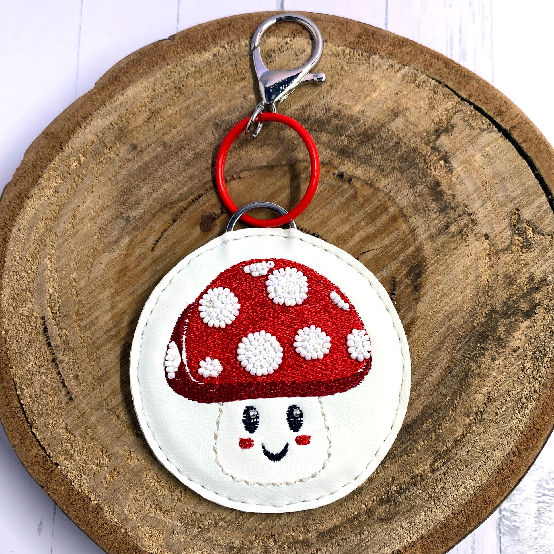 Made of black water-resistant vinyl fabric, thread, glass beads and metal keyrings that can be easily attached to a bag.