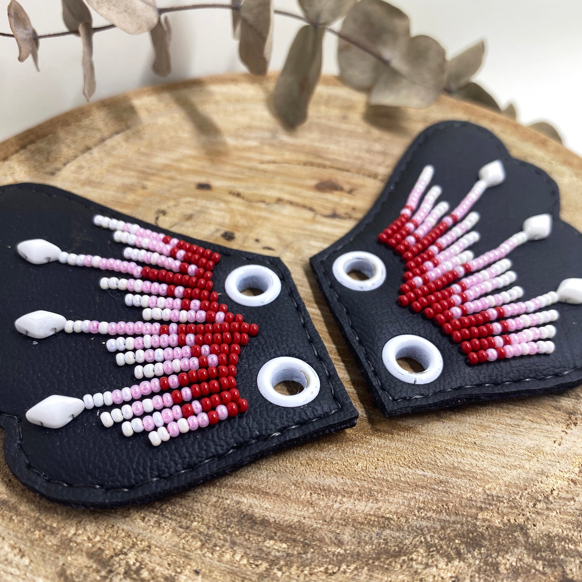 Made of water resistant vinyl fabric, thread, glass beads and metal eyelets that allow the laces to pass through.