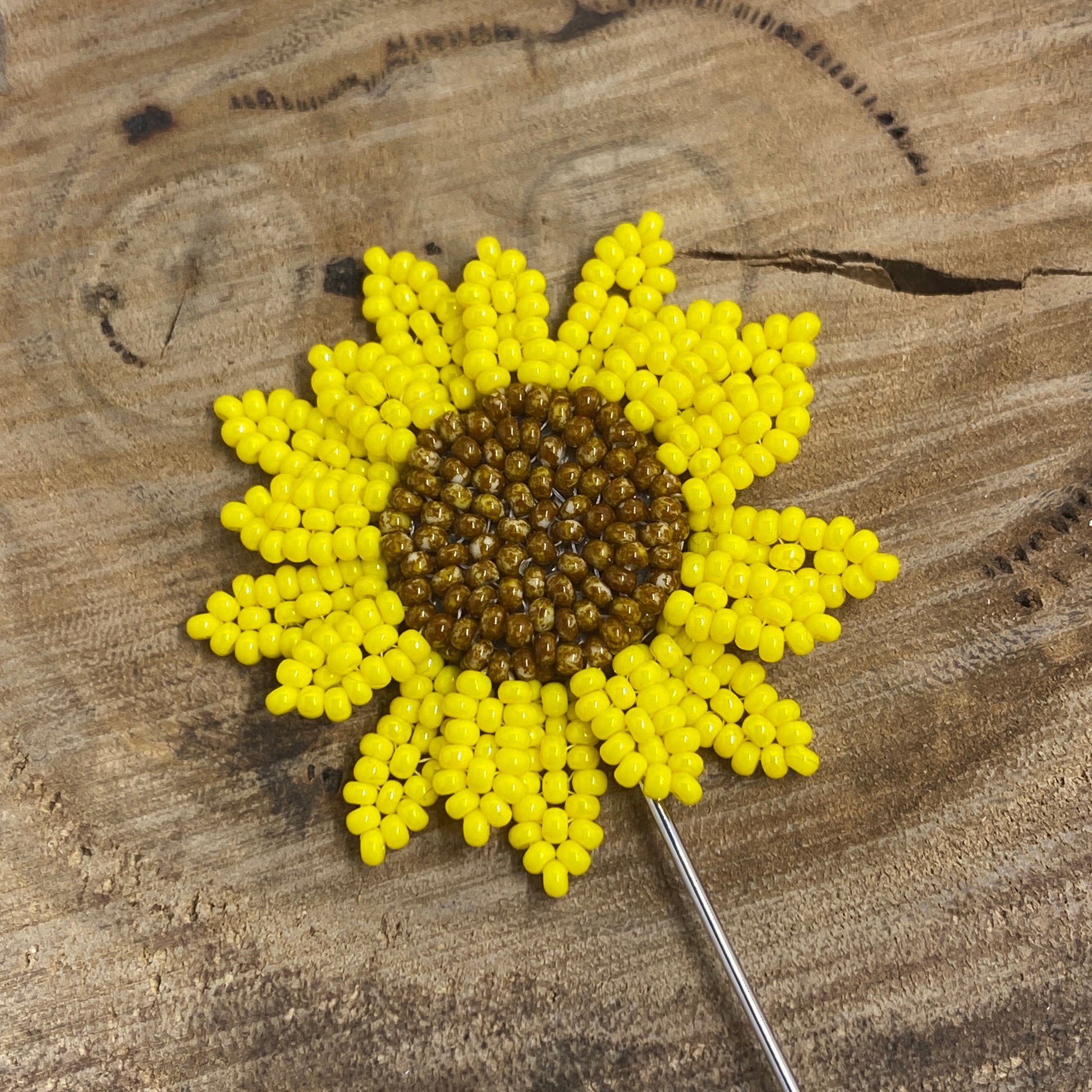 This handmade beaded sunflower brooch is made with tiny brown and yellow beads encasing a stainless steel long brooch/hat pin.