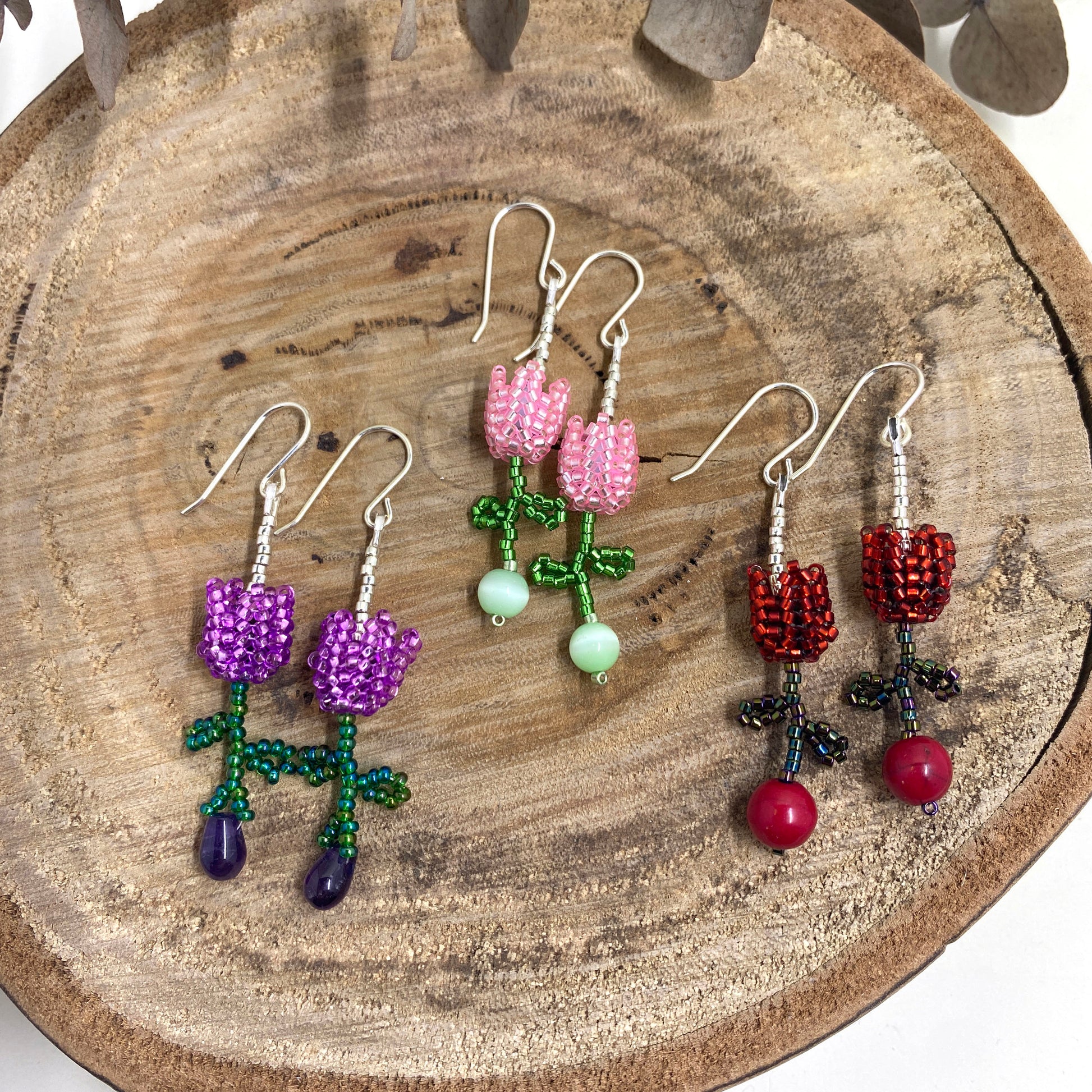 These beaded 3D tulip earrings are made with seed beads interwoven and finished with sterling silver hooks. Choose from: